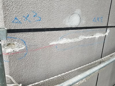 石の目地として見せている黒い線とは別に、仕上げにひび割れが出ていました。