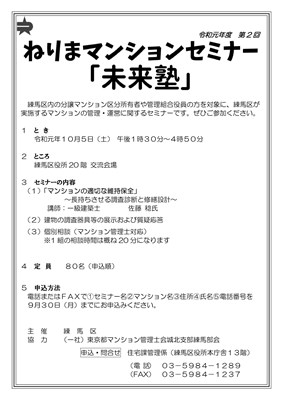 2019年10月1日 / 最終更新日時 : 2021年1月6日 akiyuki ブログ 2019年10月 『練馬区』による管理組合向けセミナー コメントを残す コメントをキャンセルメールアドレスが公開されることはありません。 * が付いている欄は必須項目ですコメント 名前 * メール * サイト 次回のコメントで使用するためブラウザーに自分の名前、メールアドレス、サイトを保存する。