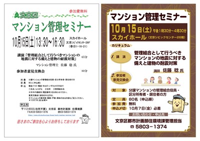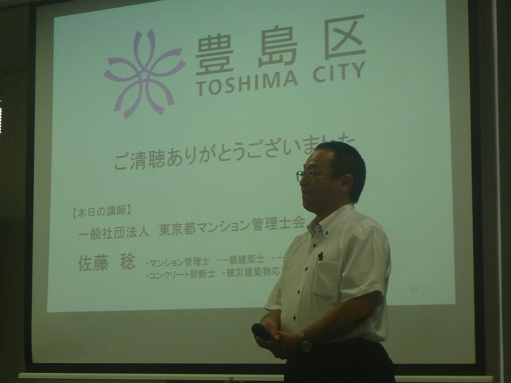 『文京区』から一般社団法人 東京都マンション管理士会へ依頼された防災に関するセミナーで、代表の佐藤が『あなたのマンション大丈夫?!~来る大規模修繕工事に備えて』を題目として講師を務めました